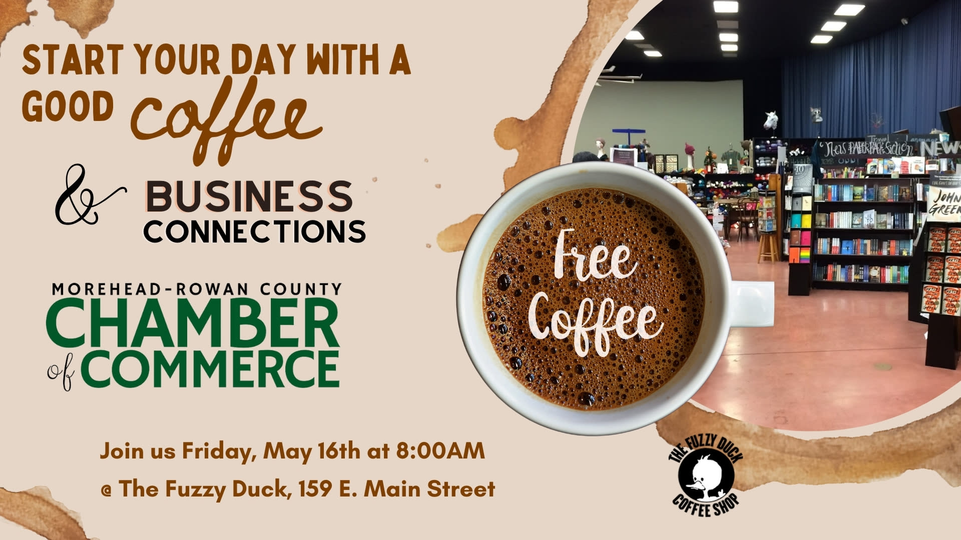 Come join us for a morning of networking, free coffee, and muffins. Business Connection is hosted each month at the Fuzzy Duck Coffee Shop located at 159 East Main Street, Morehead! Come when you can and leave when you want. This event is free to members.