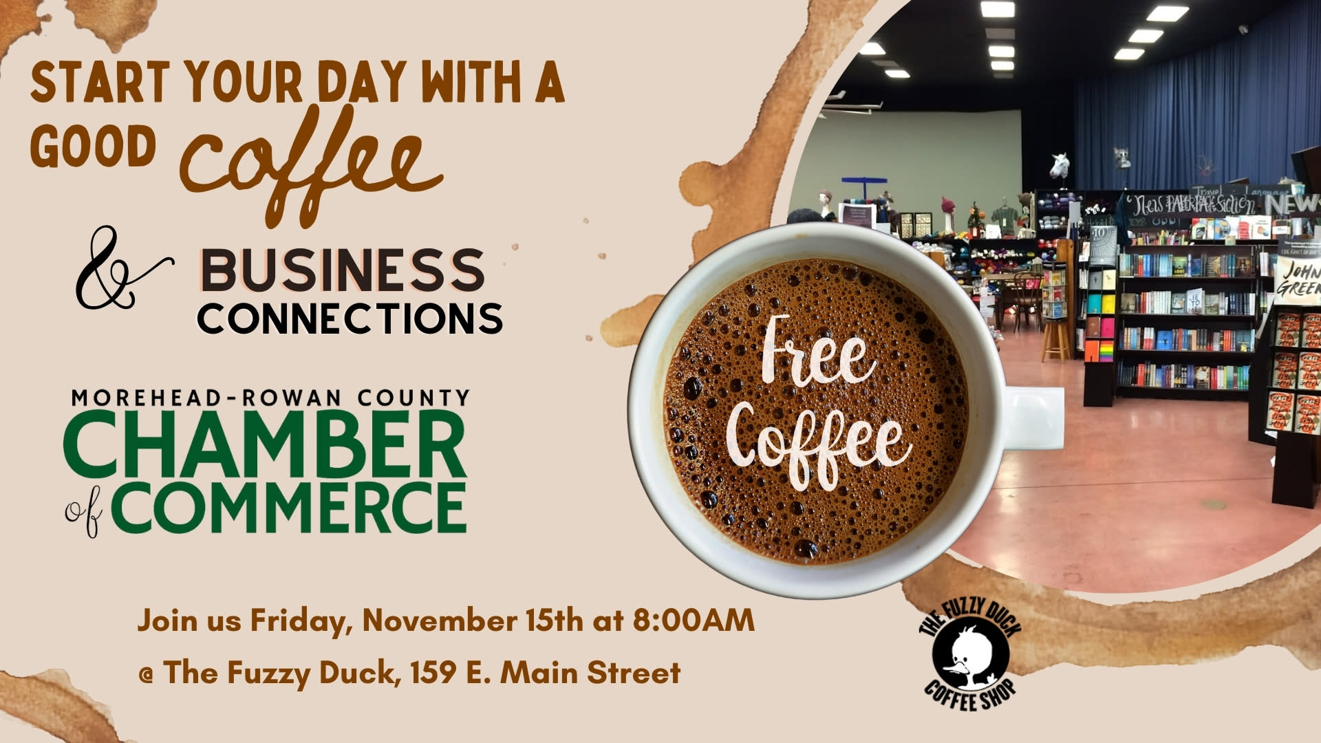 Come join us for a morning of networking, free coffee, and muffins. Business Connection is hosted each month at the Fuzzy Duck Coffee Shop located at 159 East Main Street, Morehead! Come when you can and leave when you want. This event is free to members.Images