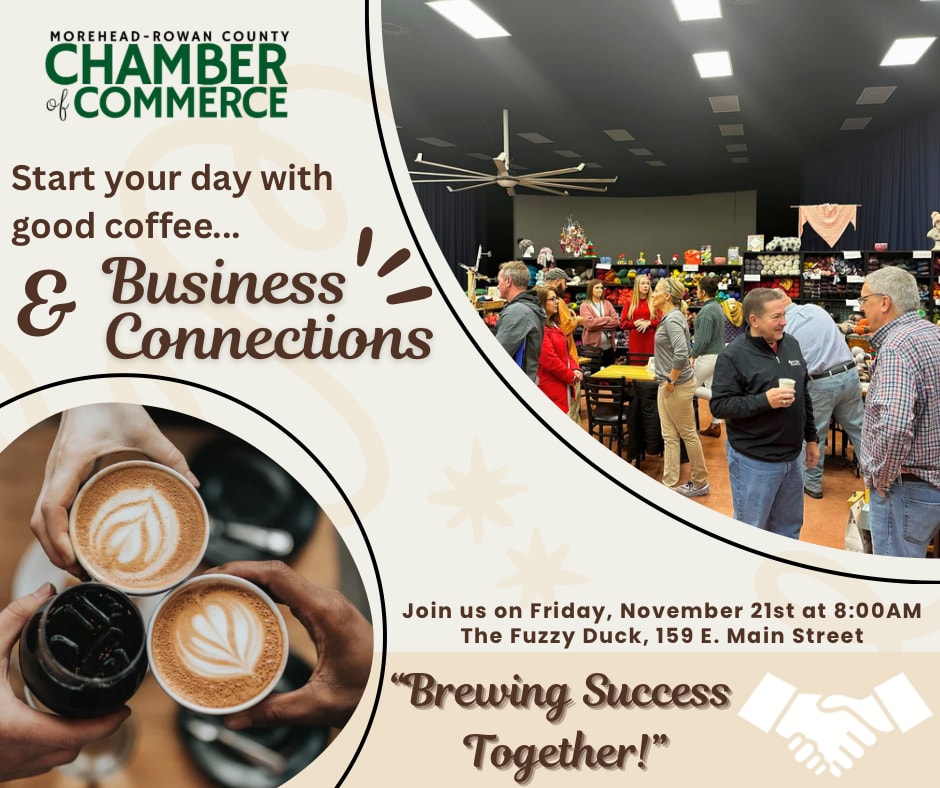 Come join us for a morning of networking, free coffee, and muffins — proudly sponsored this month by the Rowan County Community Fund! Business Connections is hosted each month at the Fuzzy Duck Coffee Shop, located at 159 East Main Street in Morehead. Come when you can and leave when you want. This event is free to members.