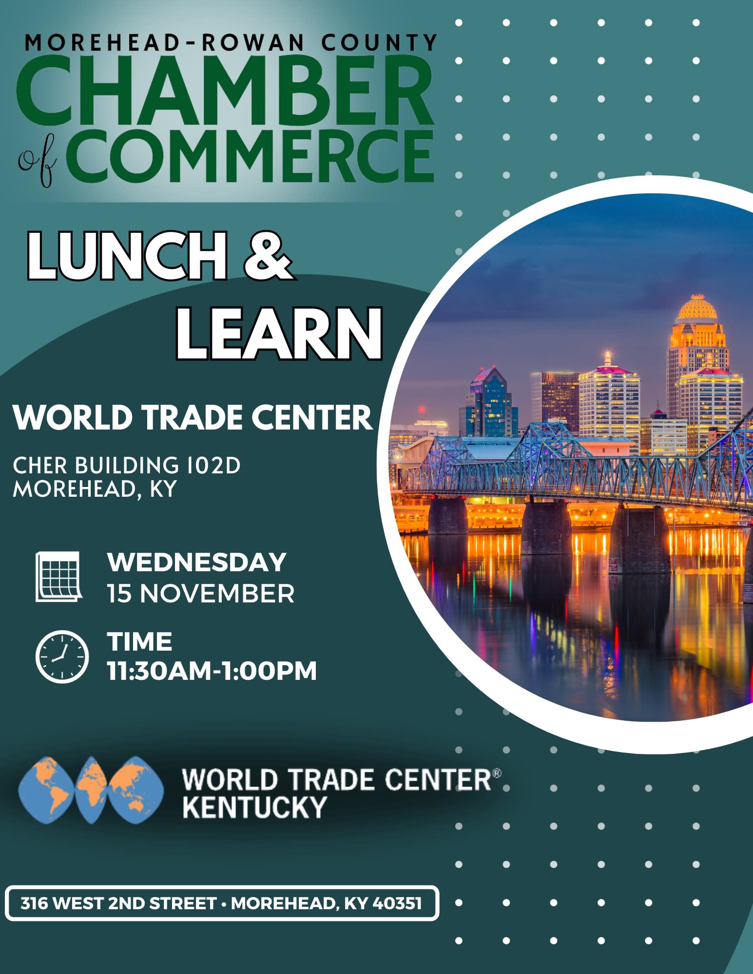 Please join us November 15, 2023, at 11:30AM to hear about the services available too small businesses and entrepreneurs. The World Trade Center Kentucky (WTC-KY) is the leading provider of trade education, trade advisory, and trade missions across the state.Images