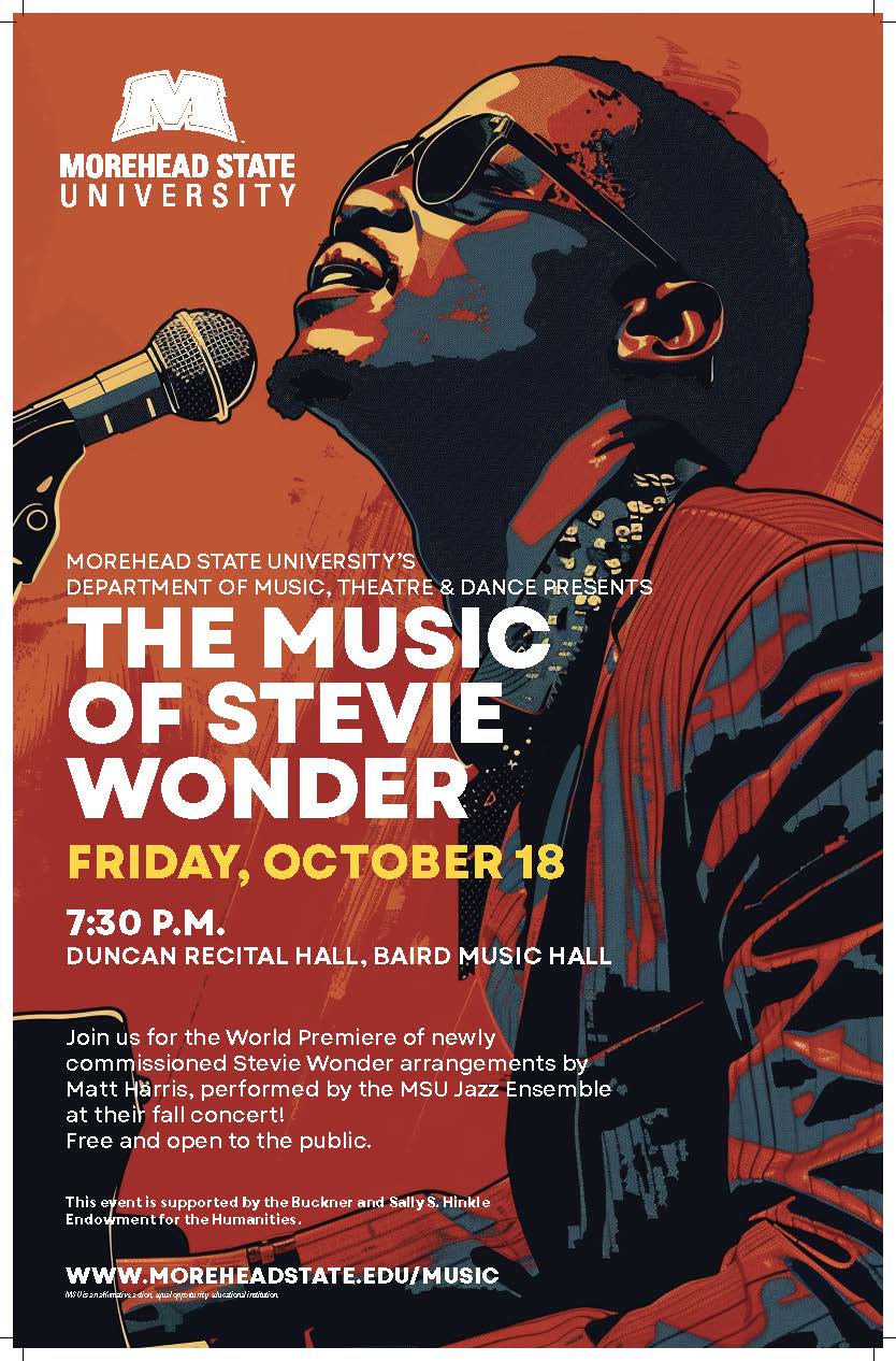Join us Friday, October 18th for the world premiere of newly commissioned Stevie Wonder arrangements by Matt Harris, performed by the MSU Jazz Ensemble at their fall concert. FREE and open to the public. Duncan Recital Hall, Baird Music Hall on the Campus of Morehead State University.Images