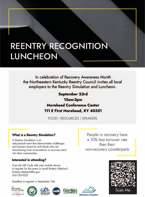 In celebration of Recovery Awareness Month the Northeastern Kentucky Reentry Council invites all local employers to the Reentry Simulation and Luncheon on September 23rd from 10am-2pm at the Morehead Conference Center!