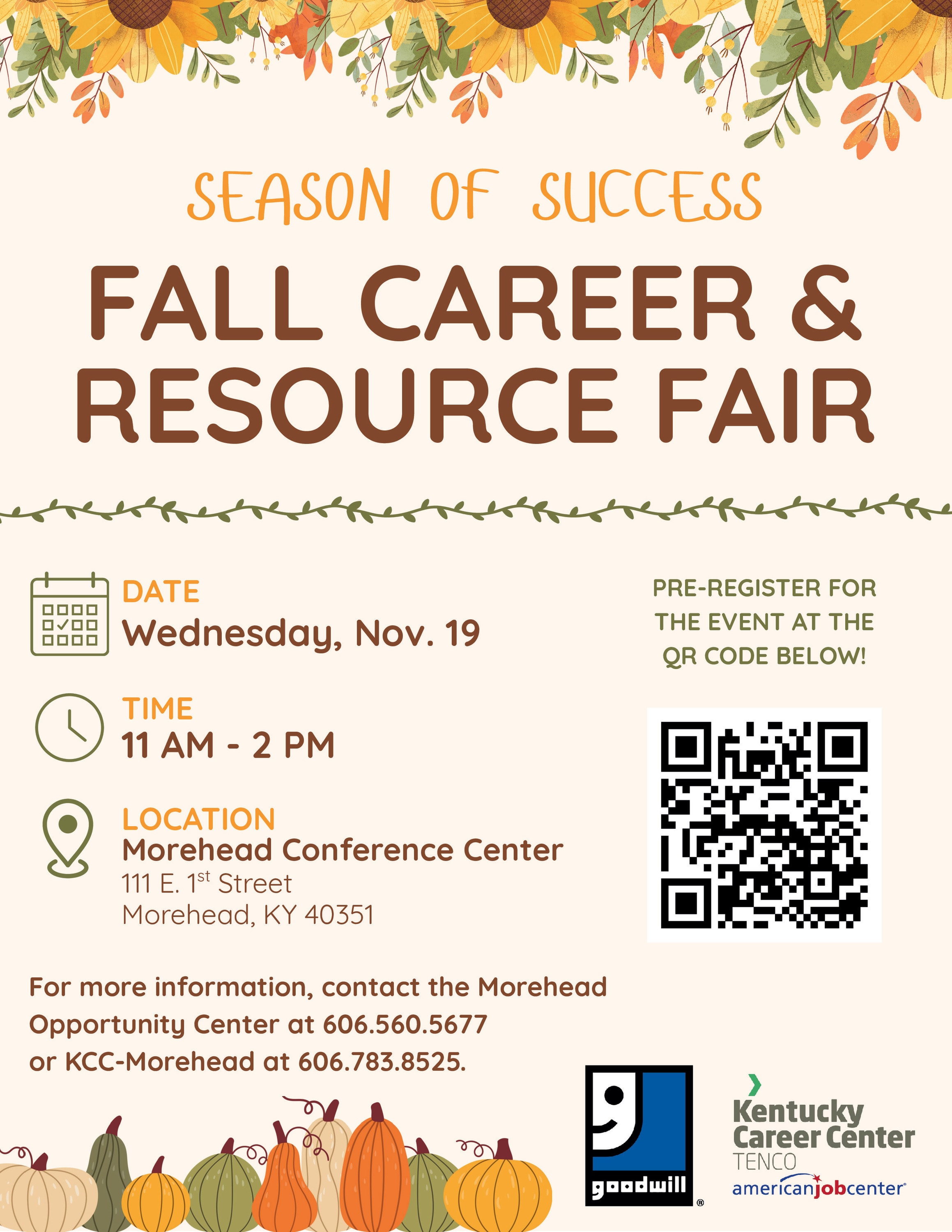 The upcoming Season of Success: Fall Career & Resource Fair will be on Wednesday, November 19, from 11 AM – 2 PM at the Morehead Conference Center. Job seekers can pre-register using the QR code on the job seeker flyer.Images