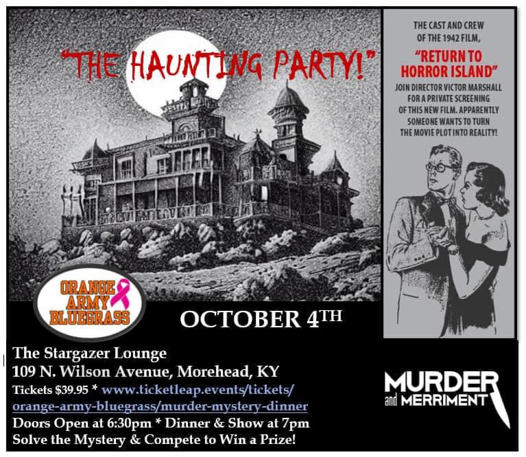 Tickets for Murder Mystery Dinner in Morehead from TicketLeap Murder Mystery: Dinner & Show. Solve the mystery and compete to win a prize! Dinner and show at 7PM. Tickets are $39.95 each. Its a Haunting party with Orange Army Bluegrass! Come out for a night of mystery and dinner at The Stargazer Lounge in Morehead KY. It's a Murder Myster Dinner night! Grab a date, get your tickets and join us. Doors open at 6:30pm, Dinner & Show at 7pm. Solve the mystery & Compete to win a prize! All tickets are presale only. No tickets will be sold at the door. Dinner will be buffet style Italian dinner with dessert! Soft drink or water included with your dinner. All alcoholic beverages are sold separately. We hope to see you there! Beginning at 9:30pm we do have a dj coming so hang around for the after dinner fun. This event is for those 18years and older.