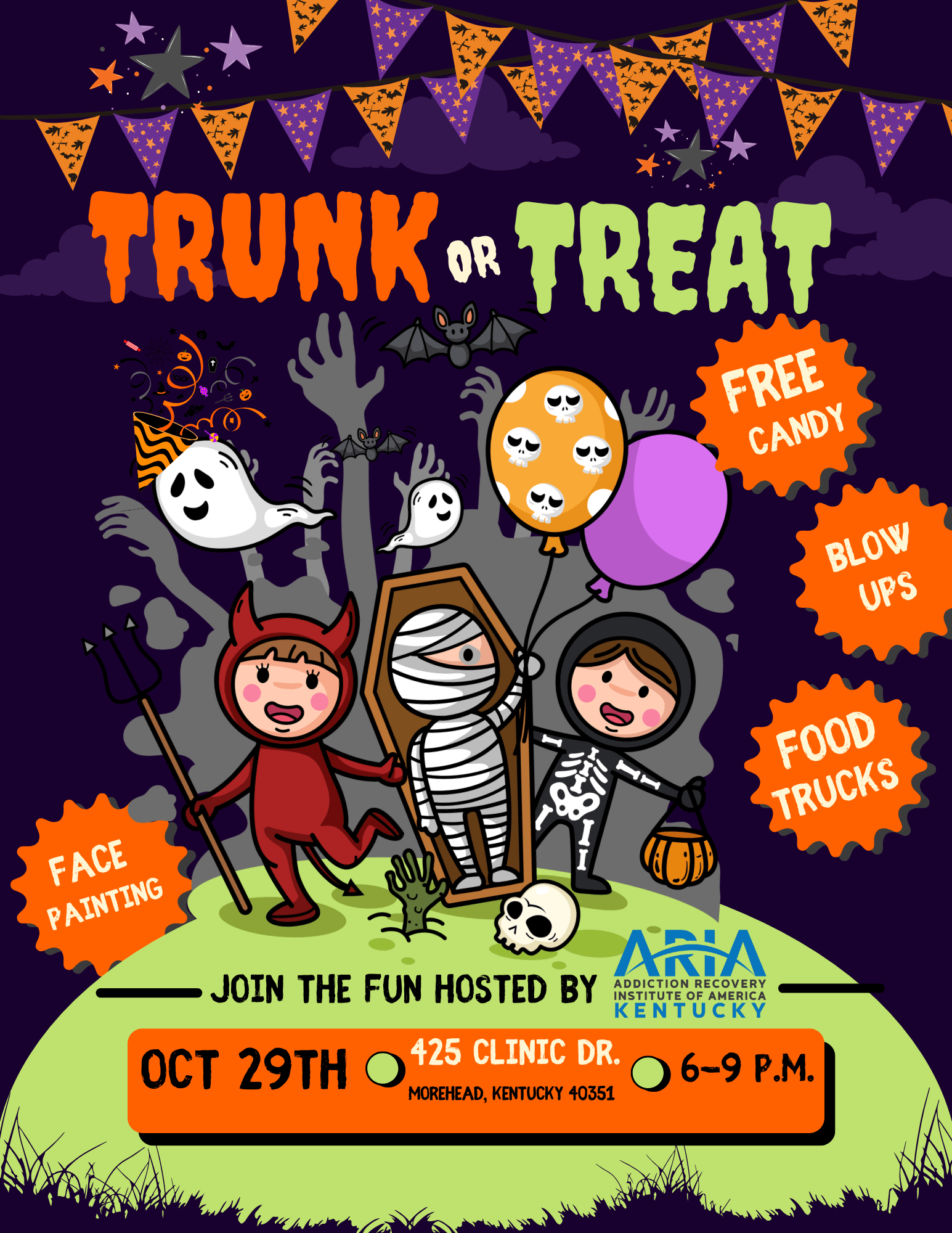 Get your costumes ready and enjoy an evening of FREE candy, inflatables, food trucks, and face painting! Join the fun hosted by ARIA (Addiction Recovery Institute of America) on Wednesday, October 29th from 6-9PM |425 Clinic Drive.Images