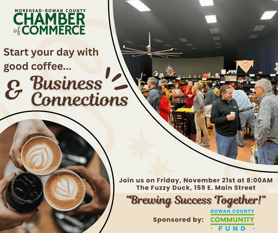 Come join us for a morning of networking, free coffee, and muffins — proudly sponsored this month by the Rowan County Community Fund! Business Connections is hosted each month at the Fuzzy Duck Coffee Shop, located at 159 East Main Street in Morehead. Come when you can and leave when you want. This event is free to members.