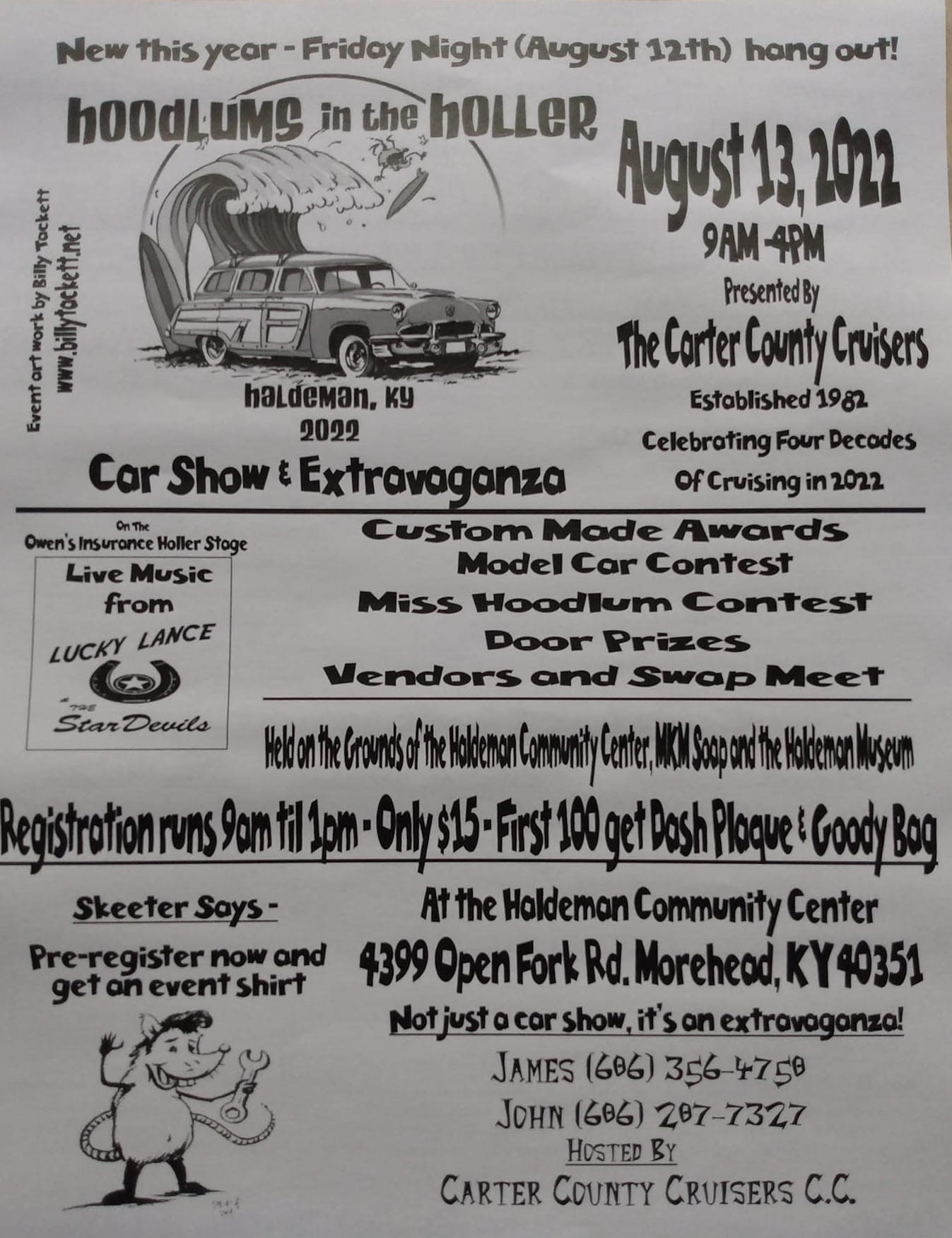 Back for it’s 11th year, Hoodlums in the Holler Car Show will be doing the following awards: * The 40 * The One * The King Of Clubs * The Hard Hat Award * Road Weary * Eye Poppin Paint * Manic Motor * Chopped to Perfection Once again this year, the show will have a Miss Hoodlum contest, live music and a Model Car Contest. Get event updates HERE!