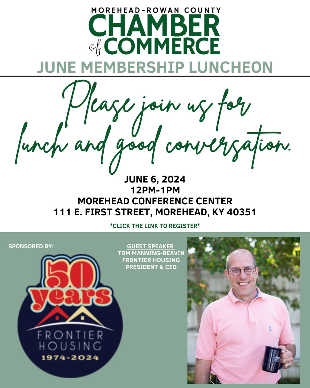Mark your calendar for the June Membership Luncheon on June 6, 2024, hosted by Frontier Housing Inc. This month, we welcome Tom Manning Beavin, President/CEO of Frontier Housing Inc., as our guest speaker. Don't miss the opportunity to register now and discover more about Frontier Housing's future projects aimed at offering affordable housing options to Kentuckians.Images