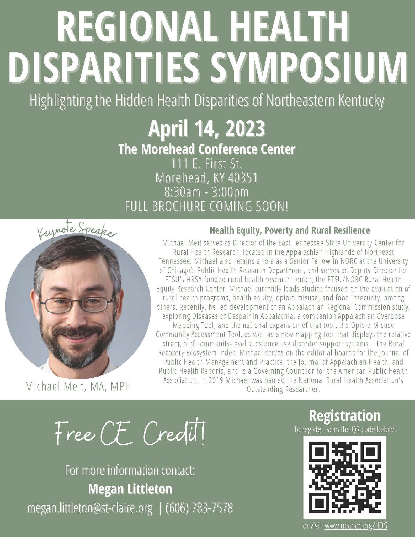Please join us for our first Regional Health Disparities Symposium on April 14th at the Morehead Conference Center from 8:30AM-3PM! The symposium will feature a keynote speaker, two panel discussions, a presentation on recovery, and an interactive group activity. There will be a diverse lineup of speakers and panelists who will be discussing myriad subjects related to Northeast Kentucky’s hidden health disparities. Below is a description of keynote speaker Dr. Michael Meit’s presentation: “While rural populations comprise about 20% of the United States population, they experience significantly more health disparities as compared to non-rural residents, including lower educational attainment, lower socio-economic status, and more limited access to health care services. This session will highlight rural health disparities and how they vary by region, describe Kentucky’s health inequities, present measures of rural prosperity that can help us to understand factors of both risk and resilience of our rural communities, and identify rural strengths and assets than can be leveraged to improve community health.”
